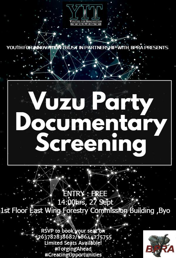 Youth For innovation Trust (YIT) in partnership with Bulawayo Progressive Residents Association (BPRA) will on the 27th of September at 1400 hrs screen a VUZU party documentary produced by Bulawayo Progressive Residents Association. VUZU Parties have been the talk of the town over the past few months across the city of Bulawayo. The behaviour of… Continue reading YIT screens Vuzu party Documentary
